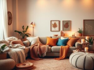 Inwestuj w świeczniki i lampiony, które wprowadzą przyjemne, ciepłe światło. Warto również wykorzystać kosze z trawy morskiej lub wikliny, które dodają przytulności i naturalnego uroku. Elementy z naturalnych materiałów w ciepłej kolorystyce uzupełniają ogólny efekt ocieplenia, tworząc przyjemny, przytulny klimat.